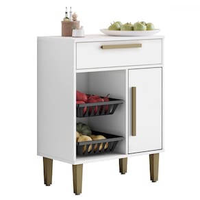 O(a) Armário de Cozinha 1 Porta 1 Gaveta com Fruteira Branco - Kaiki Móveis é produzido em MDP na escala de brilho Fosco, e possui um grau de dificuldade de montagem: Médio.