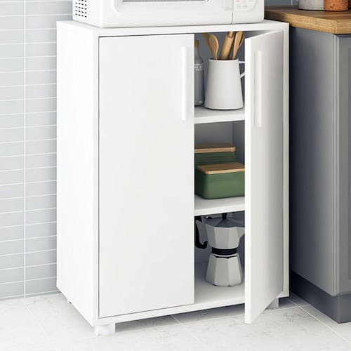 O(a) Armário de Cozinha 2 Portas 2 Prateleiras Branco Bmu 91 - Brv é produzido em MDP na escala de brilho Fosco, e possui um grau de dificuldade de montagem: Médio.