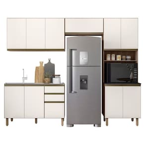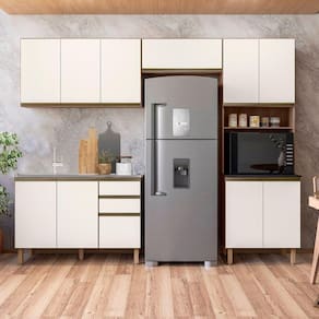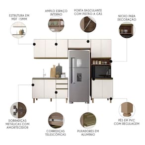 Com uma estrutura robusta em MDF de 15mm, este conjunto garante durabilidade e resistência. O acabamento em pintura UV confere um visual moderno e fácil de limpar, enquanto as dobradiças metálicas com amortecedores e os puxadores de alumínio proporcionam um fechamento suave e silencioso das portas. O Paneleiro Para Micro-Ondas, com quatro portas, oferece amplo espaço de armazenamento, além de nichos estrategicamente posicionados para eletrodomésticos e condimentos. O Armário Aéreo de 120cm, com três portas e uma prateleira interna, otimiza o espaço vertical, permitindo a organização eficiente da cozinha. O Balcão com Pia Inox de 120cm com cuba e válvula, inclui duas portas e três gavetas com corrediças telescópicas, garantindo acesso fácil e organização dos utensílios. Os pés em PVC são ajustáveis, assegurando estabilidade em qualquer superfície. Por fim, o Armário Basculante aéreo de 80cm, com pistão a gás, reflete o cuidado na fabricação, promovendo um uso confortável e prolongando a vida útil do móvel. Este kit completo é a solução ideal para quem busca uma cozinha organizada, elegante e prática.