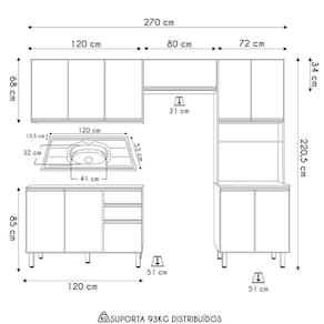 Conteúdo da Embalagem: 1 Balcão 120cm, 1 Armário Aéreo 120cm, 1 Armário Basculante, 1 Paneleiro, 1 Pia Inox 120cm.