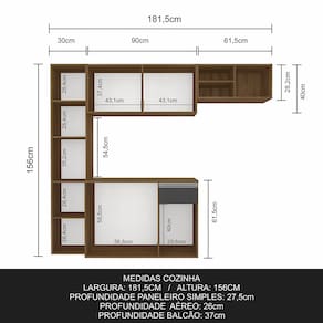 - Medidas da Cozinha Montada: A:156cm | L:181,5cm | P:37cm
