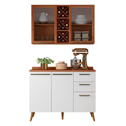 Armário De Cozinha Compacta 4 Portas 3 Gavetas Vidro Reflecta Com Adega 1,20m Favorita Branco/nature Nature