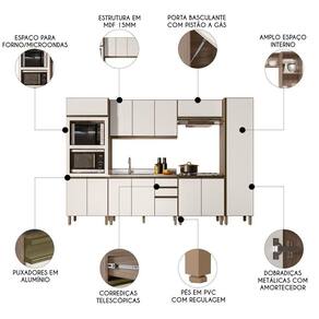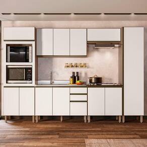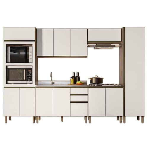 O Paneleiro Torre Quente Duplo, é um móvel funcional e moderno, projetado para oferecer praticidade e organização ao ambiente. Com duas portas inferiores e uma prateleira interna, oferece espaço adicional para armazenar e organizar. A porta superior basculante com pistão a gás facilita o acesso e integra eletrodomésticos como forno e micro-ondas ao móvel. O Armário de Cozinha Aéreo 120cm oferece três portas e uma prateleira interna para organizar itens de diferentes tamanhos. O Balcão Com Pia inox 120cm com cuba e válvula para auxiliar no dia a dia, possui duas portas e três gavetas espaçosas, incluindo um gavetão, com pés em PVC reguláveis que asseguram estabilidade mesmo em pisos irregulares. O Armário Aéreo Basculante 80cm, com pistão a gás, proporciona um movimento suave e silencioso ao abrir e fechar a porta, aumentando a durabilidade do armário. O Balcão Para Cooktop conta com duas portas, o tampo tem recorte para cooktop 4 bocas e marcação para 5 bocas. O Paneleiro de 50cm com uma porta única que facilita o acesso às três prateleiras internas, é uma peça chave para manter a organização e agregar valor estético à cozinha. Todos os móveis possuem estrutura em MDF de 15mm, acabamento em pintura UV, dobradiças metálicas com amortecedor para um fechamento suave e silencioso, e puxadores em alumínio.