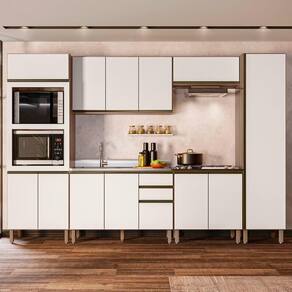 O Paneleiro Torre Quente Duplo, é um móvel funcional e moderno, projetado para oferecer praticidade e organização ao ambiente. Com duas portas inferiores e uma prateleira interna, oferece espaço adicional para armazenar e organizar. A porta superior basculante com pistão a gás facilita o acesso e integra eletrodomésticos como forno e micro-ondas ao móvel. O Armário de Cozinha Aéreo 120cm oferece três portas e uma prateleira interna para organizar itens de diferentes tamanhos. O Balcão Com Pia inox 120cm com cuba e válvula para auxiliar no dia a dia, possui duas portas e três gavetas espaçosas, incluindo um gavetão, com pés em PVC reguláveis que asseguram estabilidade mesmo em pisos irregulares. O Armário Aéreo Basculante 80cm, com pistão a gás, proporciona um movimento suave e silencioso ao abrir e fechar a porta, aumentando a durabilidade do armário. O Balcão Para Cooktop conta com duas portas, o tampo tem recorte para cooktop 4 bocas e marcação para 5 bocas. O Paneleiro de 50cm com uma porta única que facilita o acesso às três prateleiras internas, é uma peça chave para manter a organização e agregar valor estético à cozinha. Todos os móveis possuem estrutura em MDF de 15mm, acabamento em pintura UV, dobradiças metálicas com amortecedor para um fechamento suave e silencioso, e puxadores em alumínio.