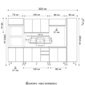 Conteúdo da Embalagem: 1 Balcão 120cm, 1 Balcão 80cm, 1 Armário Aéreo 120cm, 1 Armário Basculante, 1 Paneleiro Torre, 1 Paneleiro 50cm, 1 Pia Inox 120cm.
