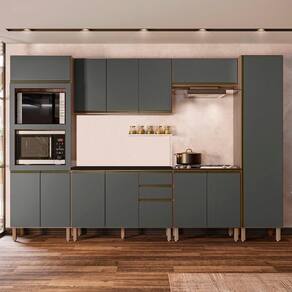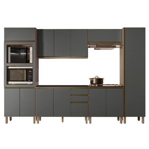 O Paneleiro Torre Quente Duplo, é um móvel funcional e moderno, projetado para oferecer praticidade e organização ao ambiente. Com duas portas inferiores e uma prateleira interna, oferece espaço adicional para armazenar e organizar. A porta superior basculante com pistão a gás facilita o acesso e integra eletrodomésticos como forno e micro-ondas ao móvel. O Armário de Cozinha Aéreo 120cm oferece três portas e uma prateleira interna para organizar itens de diferentes tamanhos. O Balcão Gabinete 120cm já com tampo para auxiliar no dia a dia, possui duas portas e três gavetas espaçosas, incluindo um gavetão, com pés em PVC reguláveis que asseguram estabilidade mesmo em pisos irregulares. O Armário Aéreo Basculante 80cm, com pistão a gás, proporciona um movimento suave e silencioso ao abrir e fechar a porta, aumentando a durabilidade do armário. O Balcão Para Cooktop conta com duas portas, o tampo tem recorte para cooktop 4 bocas e marcação para 5 bocas. O Paneleiro de 50cm com uma porta única que facilita o acesso às três prateleiras internas, é uma peça chave para manter a organização e agregar valor estético à cozinha. Todos os móveis possuem estrutura em MDF de 15mm, acabamento em pintura UV, dobradiças metálicas com amortecedor para um fechamento suave e silencioso, e puxadores em alumínio.