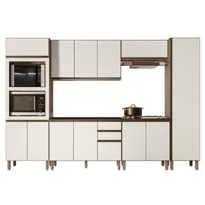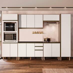 O Paneleiro Torre Quente Duplo, é um móvel funcional e moderno, projetado para oferecer praticidade e organização ao ambiente. Com duas portas inferiores e uma prateleira interna, oferece espaço adicional para armazenar e organizar. A porta superior basculante com pistão a gás facilita o acesso e integra eletrodomésticos como forno e micro-ondas ao móvel. O Armário de Cozinha Aéreo 120cm oferece três portas e uma prateleira interna para organizar itens de diferentes tamanhos. O Balcão Gabinete 120cm já com tampo para auxiliar no dia a dia, possui duas portas e três gavetas espaçosas, incluindo um gavetão, com pés em PVC reguláveis que asseguram estabilidade mesmo em pisos irregulares. O Armário Aéreo Basculante 80cm, com pistão a gás, proporciona um movimento suave e silencioso ao abrir e fechar a porta, aumentando a durabilidade do armário. O Balcão Para Cooktop conta com duas portas, o tampo tem recorte para cooktop 4 bocas e marcação para 5 bocas. O Paneleiro de 50cm com uma porta única que facilita o acesso às três prateleiras internas, é uma peça chave para manter a organização e agregar valor estético à cozinha. Todos os móveis possuem estrutura em MDF de 15mm, acabamento em pintura UV, dobradiças metálicas com amortecedor para um fechamento suave e silencioso, e puxadores em alumínio.