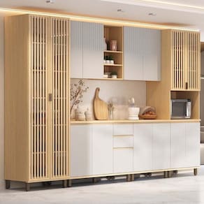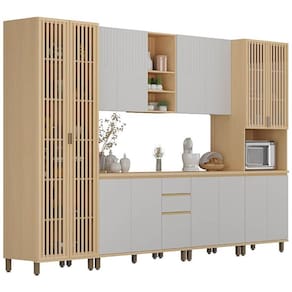 O Paneleiro de Cozinha tipo cristaleira conta com duas portas ripadas de vidro e prateleiras internas, proporcionando amplo espaço para armazenamento e um visual elegante. O Paneleiro de Cozinha Micro-ondas possui nicho específico para o micro-ondas, mantendo a cozinha organizada e moderna, também com portas ripadas de vidro e prateleiras.