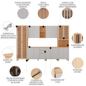 Todos os móveis apresentam acabamentos que garantem durabilidade e estilo a sua Cozinha. As portas possuem dobradiças metálicas com sistema de amortecimento, e os aéreos têm frisos elegantes. As gavetas possuem corrediças invisíveis com amortecimento, que além de garantir um deslizar suave, valoriza ainda mais o móvel. Além disso, os paneleiros e balcões possuem pés reguláveis, garantindo maior estabilidade.