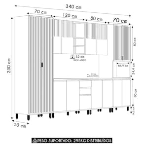 Peso Suportado Distribuído: Paneleiros 135kg/ Aéreos 71kg/ Balcões 73kg/ Tampo 15kg.