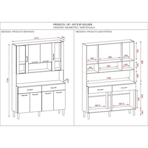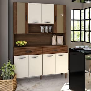 Sua cozinha merece mais espaço e organização. O Armário Compacto 8 Portas Golden é ideal para ajudar nesta tarefa. Produzido em MDP, madeira reconstituída retirada de reservas manejadas é ecologicamente correto. Com suas oito portas sendo duas das portas com vidros é sem dúvida muito espaço para os utensílios da cozinha. Conta ainda com duas amplas gavetas. Lembrando que as corrediças e dobradiças são 100% metálicas para um abrir e fechar de portas e gavetas macio e com muita segurança. O espaço interno é bem distribuído com prateleiras. Puxadores ergonômicos em plástico resistente, bem como pés fixos que dão excelente estabilidade ao produto. O acabamento em pintura em cores modernas deixam sua cozinha ainda mais bonita. Conheça a cozinha compacta 8p Golden. Acabamento da Gaveta: Pintura UV Acabamento da Porta: Pintura UV Acabamento da Prateleira: Pintura Texturizada UV Acabamento dos Pés: Polipropileno Altura dos Pés: 14.5 Ambiente Principal: Cozinha Complexidade da Montagem: Média: pode ser montado por mais de uma pessoa e/ou necessite de maior conhecimento para montagem Cor: Nogueira/Off White Cor do Produto: Nogueira/Off White Cor Interna: Nogueira Escala de Brilho: Fosco Escala de Brilho da Gaveta: Fosco Escala de Brilho da Porta: Fosco Escala de Brilho da Prateleira: Fosco Gaveta com Chave: Não Informações Complementares: Considerar um peso bem distribuído por todo o produto. Itens Inclusos: 1 Armário, Kit Ferragens e Manual de Montagem Manual de Montagem e Instalação: https://cdn2.madeiramadeira.com.br/atributo/kits-parana/1092604-197-kits-08-portas-golden.pdf Material da Dobradiça/Corrediça da Porta: Metálica Material da Gaveta: MDP Material da Porta: MDP Material da Prateleira: MDP Material do Puxador da Gaveta: Poliestireno Material do Puxador da Porta: Poliestireno Material dos Pés: Polipropileno Material Principal: MDP Necessita Montagem: Sim Origem do Produto: Nacional Pés Reguláveis: Não Peso: 44.45 Peso Máximo por Gaveta: 4 Peso Máximo por Prateleira: 12 Possui Espelho: Não Possui Possui Pés: 05 Possui Portas: 08 Possui Prateleiras: 02 Possui Rodízio: Não Recomendações de Uso, Manutenção e Limpeza: Limpeza com pano seco ou levemente umedecido não utilizar produtos abrasivos. Respeitar o limite máximo de peso informado no esquema de montagem. Evitar mover o produto com utensílios dentro. Sapatas Niveladoras: Não Sistema de Montagem: Cavilhas, Parafusos e Pregos Suporta Até (kg): 61 Tipo de Corrediça da Gaveta: Simples Tipo de Dobradiça/Corrediça da Porta: Simples Tipo de Porta: Bater Tipo de Puxador da Gaveta: Externo Tipo de Puxador da Porta: Externo