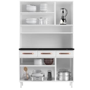 O Kit triplo da Linha Mirage New é um sonho de consumo para quem deseja trazer mais charme e funcionalidade ao ambiente. Em um único produto, o kit reúne balcão com três gavetas, armário e cristaleira, com espaço disponível de sobra para armazenar utensílios, louças e alimentos de maneira organizada. A modulação possui 03 vidros que, além de serem temperados garantindo total segurança, ainda são serigrafados com design harmônico. Os puxadores e apliques resinados na cor Cobre Fosco agregam beleza e sofisticação. As gavetas do balcão possuem corrediças metálicas, que deslizam suavemente na hora de abrir e fechar. A parte interna é fabricada em polipropileno, um plástico muito firme que suporta até 5kg de peso. Fabricada em aço, recebe pintura eletrostática e anticorrosiva, com acabamento brilhoso. O tratamento recebido na pintura garante resistência e durabilidade ao móvel. Você merece ter esse charme de cozinha em sua casa!