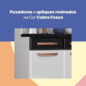 O Kit triplo da Linha Mirage New é um sonho de consumo para quem deseja trazer mais charme e funcionalidade ao ambiente. Em um único produto, o kit reúne balcão com três gavetas, armário e cristaleira, com espaço disponível de sobra para armazenar utensílios, louças e alimentos de maneira organizada. A modulação possui 03 vidros que, além de serem temperados garantindo total segurança, ainda são serigrafados com design harmônico. Os puxadores e apliques resinados na cor Cobre Fosco agregam beleza e sofisticação. As gavetas do balcão possuem corrediças metálicas, que deslizam suavemente na hora de abrir e fechar. A parte interna é fabricada em polipropileno, um plástico muito firme que suporta até 5kg de peso. Fabricada em aço, recebe pintura eletrostática e anticorrosiva, com acabamento brilhoso. O tratamento recebido na pintura garante resistência e durabilidade ao móvel. Você merece ter esse charme de cozinha em sua casa!