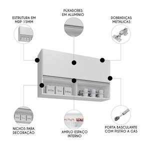 Características do Produto Material da Estrutura: MDP 15mm. Material do Fundo: MDF 3mm. Peso Suportado: 25Kg Distribuídos. Acabamento: Melamina BP. Escala de Brilho: Fosco Texturizada. Possui Prateleiras: Não. Possui Portas: Sim. Quantidade de Portas: 1 Porta. Tipo de Porta: Basculante. Tipo de Dobradiças: Metálicas. Possui Pistão a Gás: Sim. Possui Nicho: Sim. Quantidade de Nicho: 2 Nichos. Material do Puxador: Alumínio. Diferenciais: - Design moderno. - Nichos para decoração. - Porta basculante. - Pistão a gás. Sistema de Montagem: Cavilhas /Parafusos. Manual de Montagem: Sim. Complexidade da Montagem: Baixa. Volumes: 1 Volume. Conteúdo da Embalagem: 1 Armário Aéreo. Garantia do Fabricante: 90 dias contra defeito de fabricação. Montagem: Recomendamos que seja feita por um profissional. Recomendação de Limpeza: Utilize pano levemente úmido.
