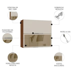 Fabricado em MDP de 15 mm, o Armário Aéreo dispõe de duas portas basculantes, sendo uma delas com vidro reflecta, conta com dobradiças metálicas, puxadores em poliestireno e pistão a gás que oferece suavidade no abrir e fechar, proporcionando mais conforto e evitando impactos. O acabamento em pintura fosca texturizada na estrutura e acetinada nas portas, com secagem realizada por luzes UV, confere ao móvel um toque agradável e elegante, além de aumentar sua resistência e durabilidade. Esse Armário de Cozinha possui prateleira interna e é perfeito para organizar seus itens com praticidade, tornando sua rotina mais eficiente.