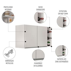 O Armário Aéreo possui duas portas convencionais com puxadores de alumínio, que garantem um toque de sofisticação e durabilidade. Além disso, as portas contam com dobradiças metálicas, que proporcionam uma abertura e fechamento suave e silencioso. O Armário Duas Portas possui uma prateleira interna, que permite organizar melhor os seus utensílios e mantimentos, aproveitando melhor o espaço. Ele acompanha também o Nicho Garrafeiro Riad, que pode ser fixado na lateral esquerda ou direita do armário aéreo e acomoda até três garrafas de vinho ou outras bebidas, deixando-as ao alcance das mãos e dando um charme especial à sua cozinha e combina com diversos estilos de decoração. Ambos são fabricados em MDP, que confere maior estabilidade e durabilidade ao móvel e possui pintura BP, que protege contra riscos, manchas e umidade, além de facilitar a limpeza.