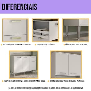 Organização e praticidade O espaçoso interior é ideal para manter utensílios e mantimentos organizados e sempre à mão. Os puxadores em ABS e pés de polipropileno com regulagem de altura garantem estabilidade e um toque moderno. Além disso, o balcão possui tampo removível e é compatível com pias de 105cm, oferecendo flexibilidade para adaptar o móvel às suas necessidades. NÃO acompanha pia.