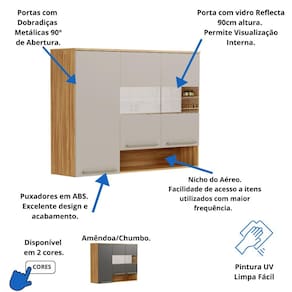 Informações do produto: Modelo: Nápoli Prime Tipo: Armário Aéreo Triplo Material: Estrutura em MDF, sendo composto por 2 portas e com acabamento em pintura UV. Altura: 90 cm Largura: 120 cm Profundidade: 30 cm Número de portas: 3 Portas Material da dobradiça: Metal Material da estrutura: MDF Material do fundo: MDF Material do puxador: ABS Necessita fixação na parede: Sim Possui chaves: Não Possui espelho/vidro: Sim Possui Fruteira: Não Tipo de Porta: Com dobradiças metálicas Espessura do Vidro Reflecta (mm): 3 Espessura do fundo (mm): 3 Espessura do material da estrutura (mm): 12 Número de nichos: 1