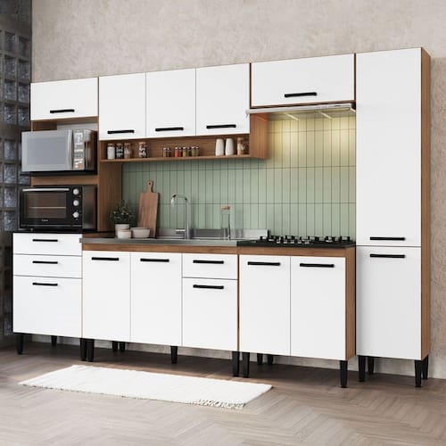 O(a) Armário de Cozinha Amanda 13 Portas 3 Gaveta Freijó/Branco - Pnr Móveis é produzido em MDP na escala de brilho Fosco, e possui um grau de dificuldade de montagem: Médio.