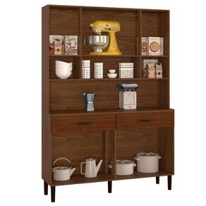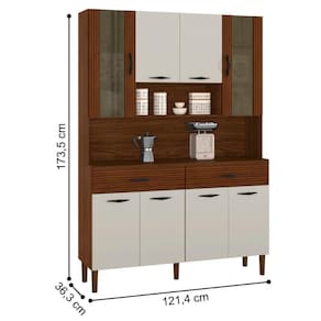 Produzido em MDP de 12mm e 15 mm, com oito portas - sendo duas portas superiores com vidro, dobradiças e corrediças 100% metálicas, duas amplas gavetas, puxadores ergonômicos em plástico resistente (poliestireno), pés fixo em plástico resistente (polipropileno).