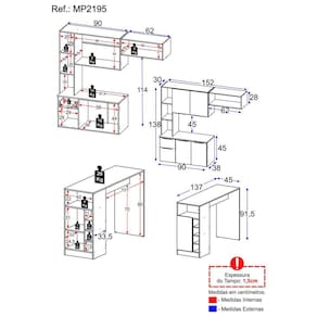 Dimensões do produto montado: Cozinha - Altura: 138cm | Largura: 152cm | Profundidade: 38cm Bancada/Mesa - Altura: 91,5cm | Largura: 137cm | Profundidade: 45cm Espaço para Fogão/Geladeira - Altura: Ajustável | Largura: 62cm *Você pode consultar as medidas detalhadas na imagem técnica do produto.