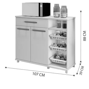 Com designer sofisticado a Fruteira Salinas é ideal para armazenamento de frutas e legumes, possui também rodízios para facilitar a movimentação. Simples e fácil de limpar suas fruteiras são removíveis. Móvel ideal para quem quer manter sua cozinha mais organizada.\nEspecificações do Produto Montado: Altura: 88 cm Largura: 107 cm Profundidade: 39 cm Peso: 36Kg Quantidade de Volume: 1\nGarantia: 3 Meses Número de Portas: 02 Número de Prateleiras: 01 Número de Gavetas: 01 Número de Cestos: 03 Possui vidro: Não Possui rodízio: Sim Necessita de montagem? Sim, sugerimos a contratação de algum profissional experiente de sua preferência Recomendações de limpeza e manutenção: Limpar com pano umedecido, não aplicar produtos químicos.\nObservações: Não oferecemos serviço de montagem, mas todos os produtos possuem manual de montagem com o passo a passo. Recomendamos contratar um profissional de montagem. Pode existir alguma diferença de tonalidade entre a foto e o produto, devido ao tratamento de imagens e à calibração de cores do monitor
