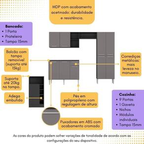 Com o Armário de Cozinha com Mesa Gourmet Pequim Multimóveis MP2205, você pode transformar sua cozinha num espaço completo e estiloso. Produzido em MDP com acabamento acetinado (cerca de 20% de brilho), este conjunto oferece durabilidade e um visual sofisticado. Com 9 portas, 1 gaveta com corrediças metálicas (mais leveza no manuseio), compartimento especial para utensílios mais altos e módulo aéreo com nichos, você terá um amplo espaço para acomodar todos os itens de forma organizada. Os módulos da cozinha são individuais (exceto o nicho para fogão/geladeira que é anexo ao armário aéreo), adaptando-se perfeitamente ao seu espaço. Os pés em polipropileno com regulagem de altura garantem estabilidade, enquanto os puxadores em ABS com acabamento cromado adicionam um toque de elegância ao móvel. Os tampos de 15mm do balcão (suporta até 15kg) e da bancada (suporta até 20kg) são resistentes, sendo que o tampo do balcão é removível (compatível apenas com pia sob medida). A bancada inclusa conta com 1 porta, prateleira interna e adega embutida, oferecendo funcionalidade adicional e a possibilidade de utilizá-la como divisora de ambientes.