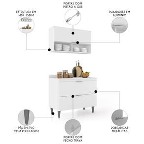 O Armário Aéreo conta com uma porta basculante com pistão a gás e dois nichos, para auxiliar na organização dos seus utensílios de forma prática e eficiente. Enquanto o Balcão Gabinete dispõe de duas portas basculantes com fecho trava de segurança, que permite o fechamento com um simples toque. Ambos possuem estrutura em MDP 15mm, com acabamento em BP, puxadores em alumínio e dobradiças metálicas, que garantem máxima resistência no uso diário. O tampo serve como apoio para eletrodomésticos ou no preparo dos alimentos, e o rodatampo que é um excelente acabamento entre o balcão e a parede. Os pés em PVC, são reguláveis, permitindo ajustar pequenos desníveis de piso. Este Armário de Cozinha é a solução ideal para otimizar sua casa, combinando materiais de alta qualidade com um design sofisticado.