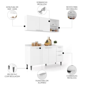 O Armário Aéreo conta com duas portas, dois nichos laterais e uma prateleira interna, para auxiliar na organização dos seus utensílios de forma prática e eficiente. Já o Balcão Gabinete dispõe de quatro portas e duas gavetas, com uma prateleira interna que oferece amplo espaço de armazenamento. Ambos possuem estrutura em MDP 15mm, com acabamento em BP, puxadores em alumínio, dobradiças e corrediças metálicas, que garantem máxima resistência no uso diário. O tampo serve como apoio para eletrodomésticos ou no preparo dos alimentos, e o rodatampo que é um excelente acabamento entre o balcão e a parede. Os pés em PVC, são reguláveis, permitindo ajustar pequenos desníveis de piso. Este Armário de Cozinha é a solução ideal para otimizar sua casa, combinando materiais de alta qualidade com um design sofisticado.