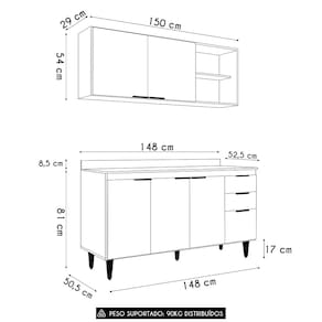 Peso Suportado Distribuído: Balcão 36 Kg / Armário 34 Kg / Tampo: 20 Kg.