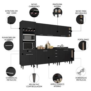 O Paneleiro conta com dois compartimentos para acomodar micro-ondas e forno elétrico, e cinco nichos na parte superior. Ele também inclui três portas, sendo uma delas basculante, além de uma gaveta para melhor organização dos seus utensílios. Os Armários Aéreos dispõe de cinco portas e duas prateleiras internas, oferecendo praticidade e estilo. O Balcão Gabinete e o Balcão 80cm possuem cinco portas e duas gavetas, com duas prateleiras internas que proporcionam amplo espaço de armazenamento. Já o Balcão Porta Pano traz um suporte de aço para guardanapos e o nicho adega que conta com três repartições. Todos os móveis possuem estrutura em MDP 15mm, com acabamento em BP, puxadores em alumínio, dobradiças e corrediças metálicas, que garantem máxima resistência no uso diário. O tampo serve como apoio para eletrodomésticos ou no preparo dos alimentos, e o rodatampo que é um excelente acabamento entre o balcão e a parede. Os pés em PVC, são reguláveis, permitindo ajustar pequenos desníveis de piso. Este Armário de Cozinha é a solução ideal para otimizar sua casa, combinando materiais de alta qualidade com um design sofisticado.