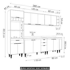 Conteúdo da Embalagem: 1 Armário Aéreo 120cm, 1 Armário Aéreo 80cm, 1 Balcão 120cm, 1 Balcão 80cm, 1 Balcão Porta Pano, 1 Paneleiro, 1 Nicho Adega, 1 Tampo.