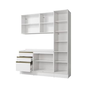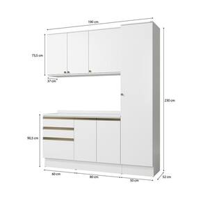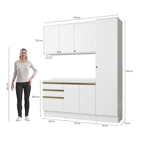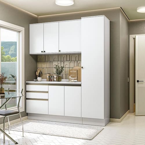 Acabamento: Pintura Brilho | Cor: Branco | Corrediças: Telescópicas | Dobradiça: Com Amortecimento | E possivel montar o produto sem os pés?: Sim | Garantia: 3 meses para defeito de fabricação | Gavetas: Externas | Matéria-prima: MDF / MDP | Peso suportado por cada prateleira: 7 kg | Peso suportado por gaveta: 6 kg | Puxadores: Alumínio / Metálicos / Puxadores de Metal e de Alumínio | Quantidade de gavetas: 3 | Quantidade de portas: 1 / 2 | Quantidade de prateleiras: 1 / 5 | Sistema de montagem: Parafuso Philips | Tipo de porta: Bater | Tipo de garantia: Garantia do fabricante | Montagem: Necessita montagem | Duração da garantia: 3 meses | Tipo de móveis de cozinha: Combo de móveis de cozinha | Requer montagem: Sim