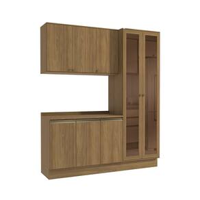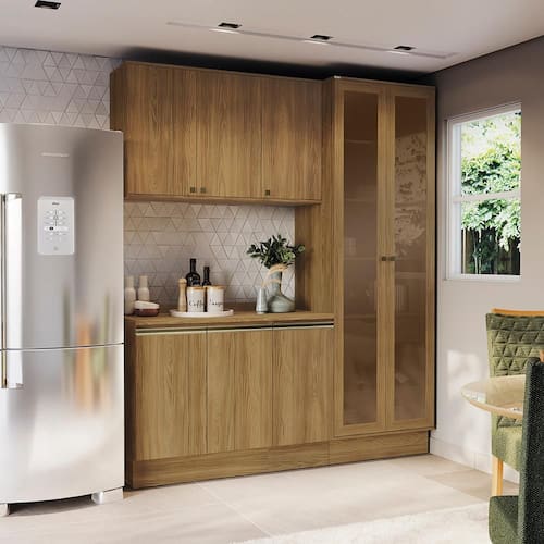 Remetendo aos tons da natureza, você terá o espaço ideal para armazenar seus itens e preparar suas receitas com praticidade. Compacto e muito moderno, o combo permite aproveitar espaço na vertical, unindo balcões, aéreos e cristaleira, uma composição versátil e indispensável para todos os espaços. Acompanhado dos tampos, os balcões também podem ser montados com pedra, oferecendo amplo espaço para organizar louças e mantimentos.