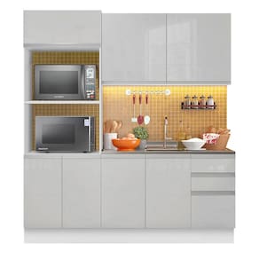 Com boa distribuição, tem lugar para forno e micro-ondas e permite organizar toda a parte de louça, panelas e utensílios.