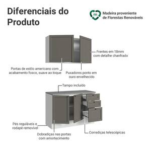 O acabamento de alta resistência da estrutura é em Branco, das frentes em Cinza e possui uma textura suave ao toque. O destaque fica por conta dos puxadores ponto em ouro envelhecido, feitos com metal resistente, trazem personalidade e um charme único. Outro diferencial está no detalhe chanfrado das frentes, que forma molduras elegantes e dá profundidade ao design.
