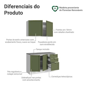 O acabamento de alta resistência da estrutura é em Branco, das frentes em Verde e possui uma textura suave ao toque. O destaque fica por conta dos puxadores ponto em ouro envelhecido, feitos com metal resistente, trazem personalidade e um charme único. Outro diferencial está no detalhe chanfrado das frentes, que forma molduras elegantes e dá profundidade ao design.