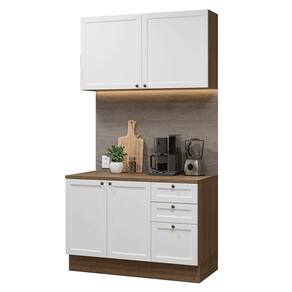 O acabamento de alta resistência da estrutura é em tom amadeirado Rustic, das frentes em Branco e possui uma textura suave ao toque. O destaque fica por conta dos puxadores ponto em ouro envelhecido, feitos com metal resistente, trazem personalidade e um charme único. Outro diferencial está no detalhe chanfrado das frentes, que forma molduras elegantes e dá profundidade ao design.