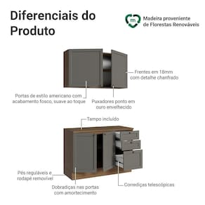 O acabamento de alta resistência da estrutura é em tom amadeirado Rustic, das frentes em Cinza e possui uma textura suave ao toque. O destaque fica por conta dos puxadores ponto em ouro envelhecido, feitos com metal resistente, trazem personalidade e um charme único. Outro diferencial está no detalhe chanfrado das frentes, que forma molduras elegantes e dá profundidade ao design.