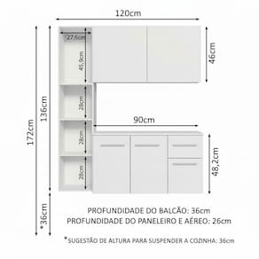 - 36 cm de profundidade do balcão e 26 cm de profundidade do paneleiro/aéreo