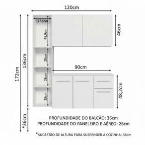 - 36 cm de profundidade do balcão e 26 cm de profundidade do paneleiro/aéreo