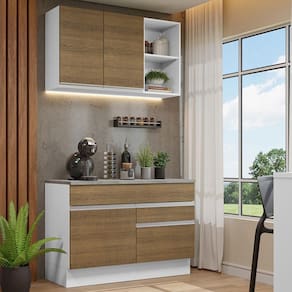 Com dois armários aéreos e um balcão, conta com bom espaço interno e externo para os utensílios e louças. Pela versatilidade do móvel, é possível utilizá-lo para a organização do cantinho do café.