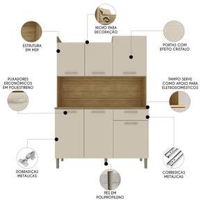 Com seis portas e uma gaveta, oferece amplo espaço de armazenamento. Ele conta com duas prateleiras internas, perfeitas para organizar eletrodomésticos, utensílios, louças e mantimentos. O Nicho na parte superior é ideal para expor objetos decorativos, dando destaque à sua Cozinha Compacta e contribuindo para uma decoração charmosa. A textura cristalo na frente das portas e gaveta confere um toque de sofisticação, além de um design moderno que eleva a beleza do ambiente.