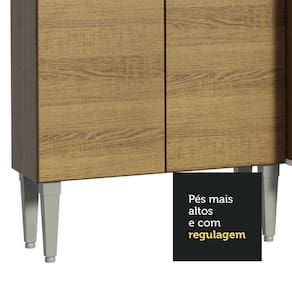 Feita com materiais robustos que garantem durabilidade, esta cozinha é equipada com corrediças e dobradiças metálicas, puxadores com alumínio e pés reguláveis em PVC, ideais para ajustes em pequenos desníveis no piso.