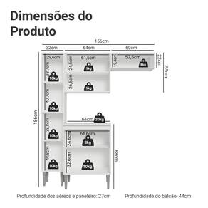 A composição conta com um paneleiro de duas portas, um balcão com duas portas e tampo, um aéreo de com duas portas e um nicho aberto. Essa versão chega no acabamento Branco, transmitindo leveza para a sua cozinha.