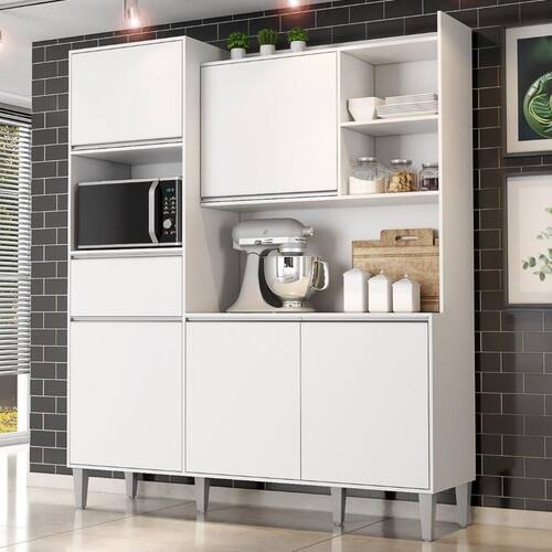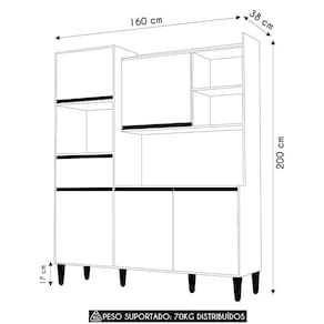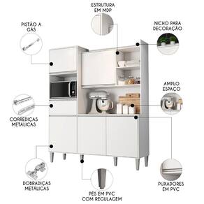 Além disso, o Armário dispõe de uma gaveta com corrediças metálicas, que deslizam com facilidade. Para complementar a organização, há quatro nichos amplos que podem ser para acomodar eletroportáteis, itens decorativos ou utensílios de uso frequente. O espaço superior também pode ser aproveitado, tornando o móvel ainda mais funcional.