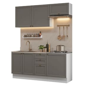 O balcão de pia, permite a instalação de pia de inox ou pedra, enquanto o balcão de 60 cm inclui tampo recortável para a instalação de cooktop. Além disso, os aéreos são ideais para manter tudo sempre ao alcance.