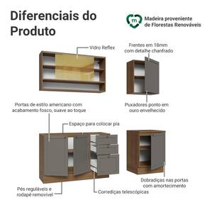 O acabamento de alta resistência da estrutura é em tom amadeirado Rustic, das frentes em Cinza e possui uma textura suave ao toque. O destaque fica por conta dos puxadores ponto em ouro envelhecido, feitos com metal resistente, trazem personalidade e um charme único. Outro diferencial está no detalhe chanfrado das frentes, que forma molduras elegantes e dá profundidade ao design.