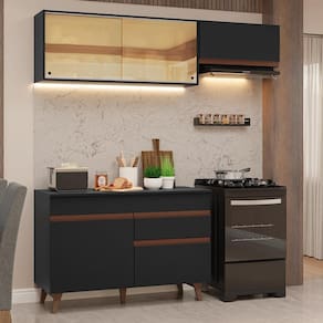 Formada por três módulos avulsos, possui materiais de alta qualidade, como corrediças e dobradiças metálicas, puxadores embutidos de alumínio e pés de madeira maciça. O vidro reflex no aéreo deixa a cozinha ainda mais sofisticada.