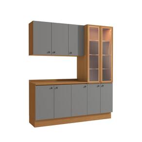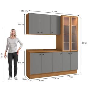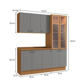 Já as frentes, na cor cinza sagrado, contam com acabamento fosco em BP, proporcionando maior durablidade contra riscos, arranhões e gotas d'água. Uma combinação elegante e moderna, que dará ainda mais destaque ao seu espaço, deixando sua cozinha perfeita. Compacto e muito moderno, unindo balcões, aéreos e cristaleira, são 2,20m de altura e 1,90m de largura, com 52cm de profundidade, para o melhor aproveitamento de espaço na vertical. Acompanhado dos tampos, os balcões também podem ser montados com pedra, oferecendo amplo espaço para organizar louças e mantimentos.